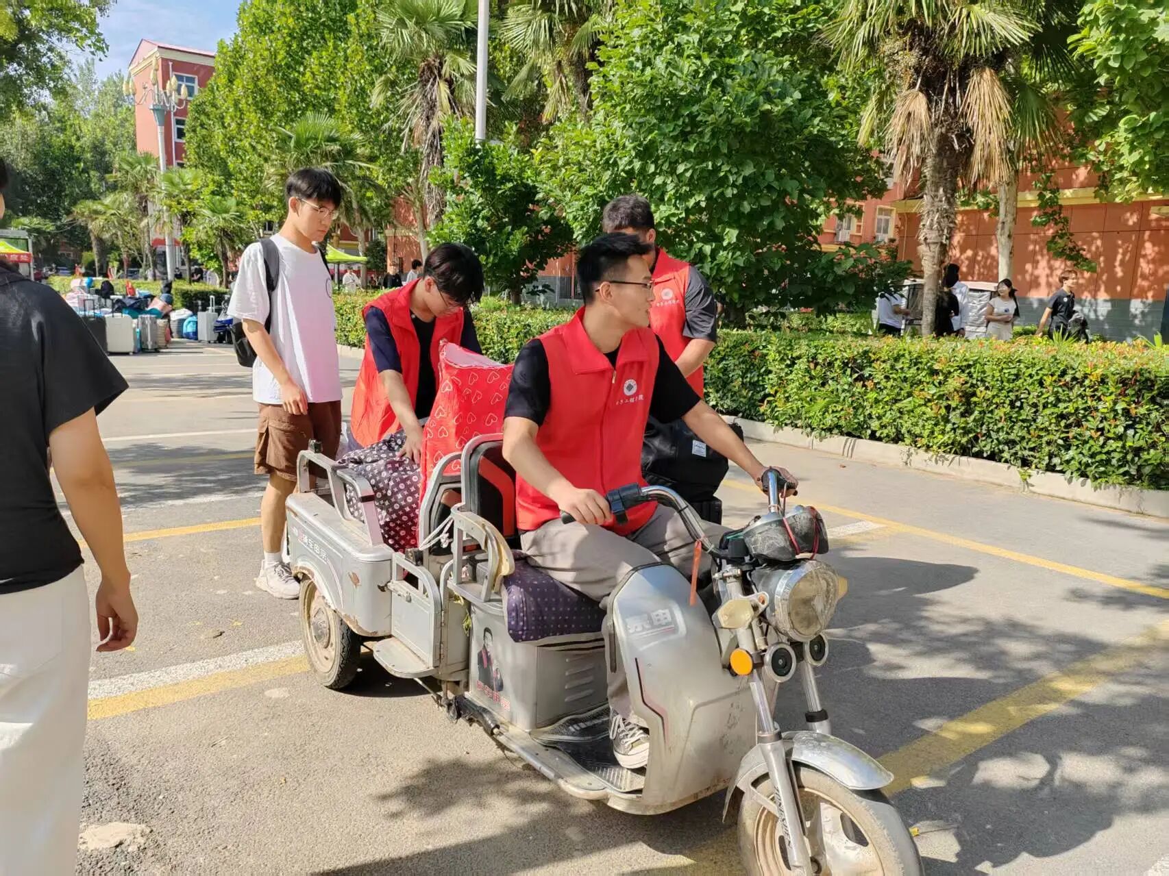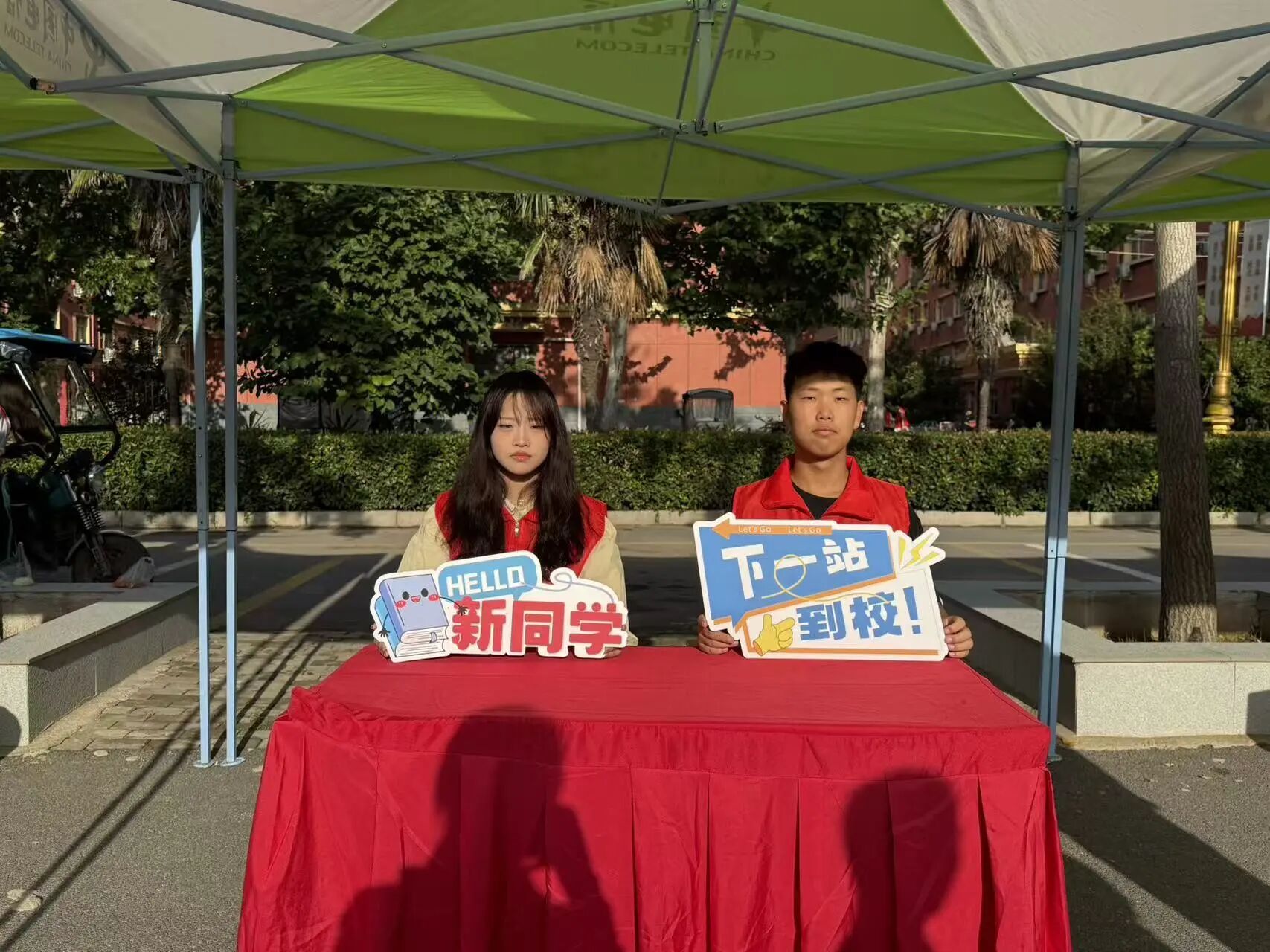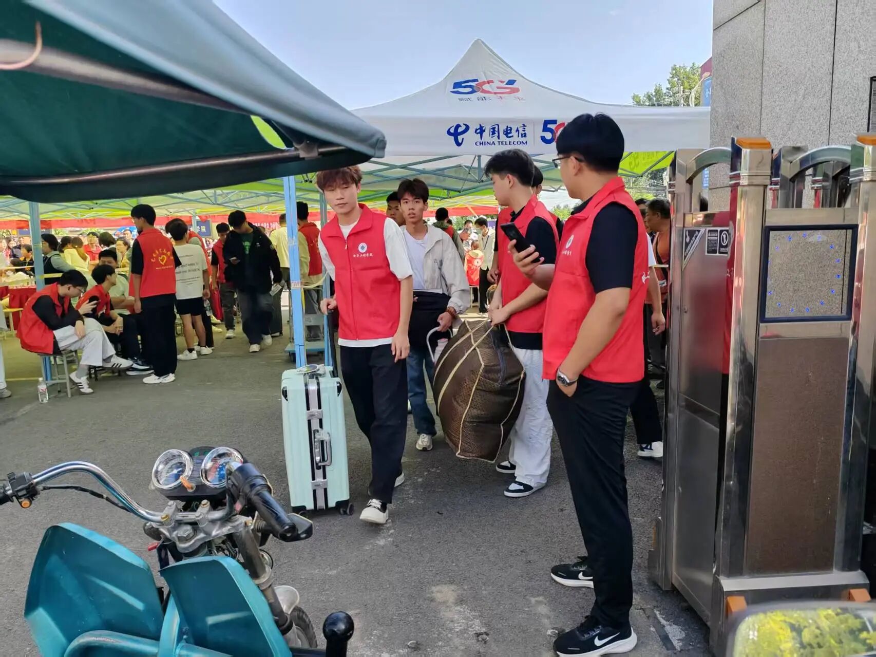 迎新现场热闹非凡,志愿者们热情地引导着新生,帮他们搬运行李;学长学姐们笑着介绍校园,分享学习生活经验;新生们眼里满是好奇与期待,和家人一起仔细打量着崭新的校园环境,处处洋溢着青春的活力与对未来的憧憬。
